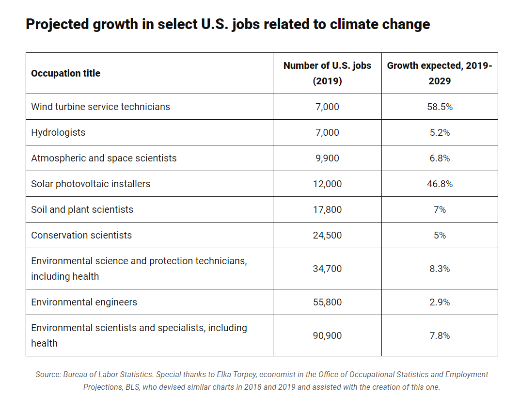 據(jù)美國(guó)勞工統(tǒng)計(jì)局的數(shù)據(jù),預(yù)計(jì)2029年前,一系列與氣候有關(guān)的職業(yè)將快速增長(zhǎng):