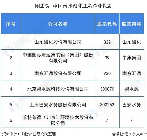 我國(guó)海水淡化工程企業(yè)較少,目前發(fā)展較好的企業(yè)有:上海巴安水務(wù)股份有限公司、萊特萊德(北京)環(huán)境技術(shù)股份有限公司、山東?;煞萦邢薰?、南方匯通股份有限公司、中國(guó)國(guó)際海運(yùn)集裝箱(集團(tuán))股份有限公司、北京碧水源科技股份有限公司等。