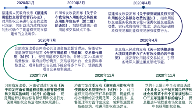 2020年用能權(quán)交易市場建設(shè)總體快于節(jié)能量交易市場,多個(gè)中央與省級政策文件出臺(tái),進(jìn)一步推動(dòng)用能權(quán)交易市場發(fā)展。