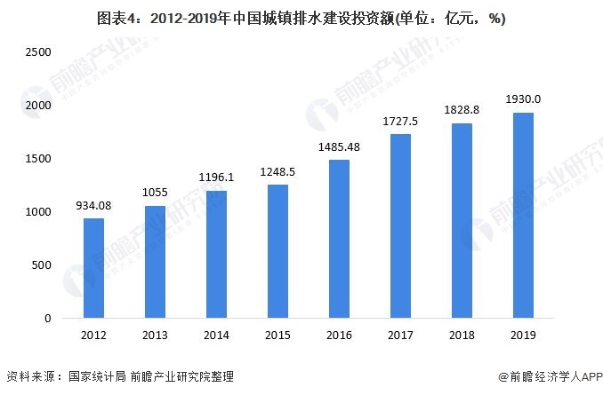 在《城市排水防澇設(shè)施建設(shè)中央預(yù)算內(nèi)投資專(zhuān)項(xiàng)管理暫行辦法》等排水投資政策的推動(dòng)下,我國(guó)水務(wù)投資持續(xù)加碼,自2013年起我國(guó)城鎮(zhèn)排水建設(shè)投資額每年快速增長(zhǎng),2012尚且為934.08億元,到2017年就已達(dá)到1727.52億元,增長(zhǎng)了近一倍,2019年投資額達(dá)1930.02億元。