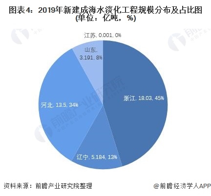 2019年我國新建海水淡化工程規(guī)模分布以華東地區(qū)、華北地區(qū)的沿海城市為主。其中浙江省海水淡化新建規(guī)模產(chǎn)能為18.03億噸,占我國海水淡化新建產(chǎn)能的45%,同時2019年浙江省海水淡化工程規(guī)模為40.78萬噸/日,是我國海水淡化行業(yè)發(fā)展最主要的城市。
