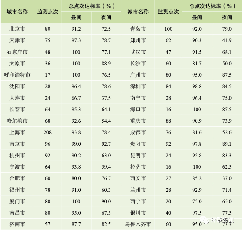 總體來看,本年度全國城市功能區(qū)聲環(huán)境質(zhì)量晝間點次達(dá)標(biāo)率高于夜間,3類功能區(qū)(工業(yè)、倉儲物流區(qū))晝間點次達(dá)標(biāo)率在各類功能區(qū)中最高。