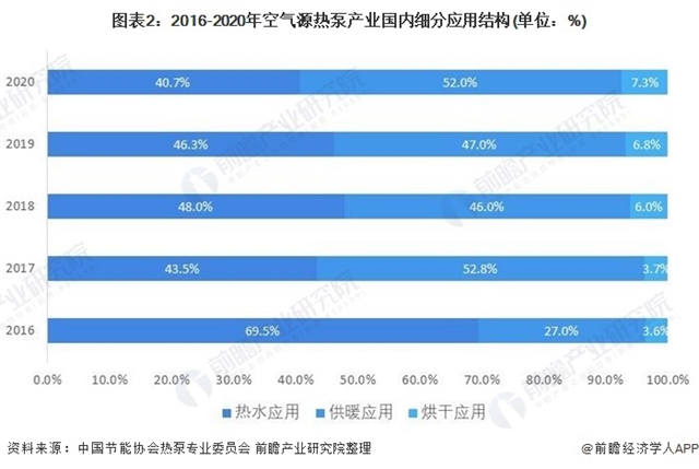 氣源熱泵應(yīng)用領(lǐng)域包括熱水市場、供暖市場、工農(nóng)業(yè)烘干市場三個主要市場,其中熱泵熱水市場和熱泵采暖市場占了市場的絕大部分且競爭激烈,所占比例之和連續(xù)三年超過90%。