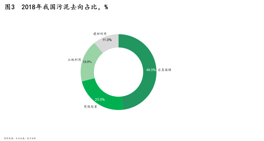 在這樣的條件下,大部分地區(qū)對污泥處理以最便利的填埋為主。以2018年為例,我國污泥去向近半成為應急填埋(見圖3),盡管填埋并非最合適的污泥處理方式:占用土地面積大,場地不宜尋找;往往治標不治本,因污泥含有重金屬及病菌,遇水極易造成二次污染,包括有害成分滲漏造成地下水污染、污泥中的營養(yǎng)物質使大量病原菌滋生繁衍等。