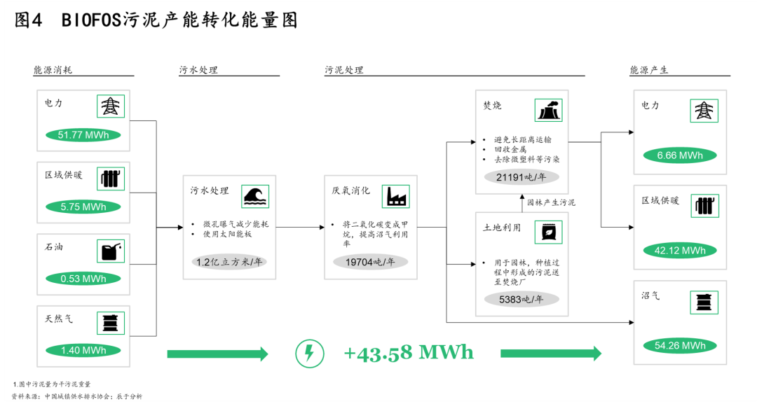 其二,30●60雙碳目標提出后,未來污泥處理處置將以節(jié)能降耗及能源資源回收為目標,這對污泥處理提出了更為清晰的技術路徑方向。例如在能源回收上,厭氧消化是優(yōu)選途徑,如丹麥污水廠BIOFOS通過污泥消化產(chǎn)能實現(xiàn)能量盈余(見圖4)。