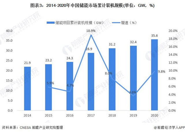 由于儲(chǔ)能在清潔利用方面的重要作用,近年來(lái),我國(guó)儲(chǔ)能項(xiàng)目裝機(jī)規(guī)模穩(wěn)步增長(zhǎng)。根據(jù)中關(guān)村儲(chǔ)能產(chǎn)業(yè)技術(shù)聯(lián)盟(CNESA)統(tǒng)計(jì),截至2020年底,我國(guó)已投運(yùn)儲(chǔ)能項(xiàng)目累計(jì)裝機(jī)規(guī)模為35.6GW,占全球市場(chǎng)總規(guī)模的18.6%,同比增長(zhǎng)9.8%。