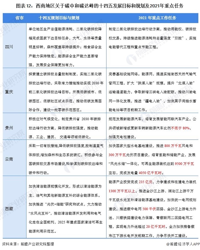 西南地區(qū)包括重慶市、四川省、貴州省、云南省、西藏自治區(qū)共五個省市區(qū)。西南地區(qū)位處于長江中上游,覆蓋云貴高原和青藏高原南部,在發(fā)展水力發(fā)電和光伏發(fā)電以及風(fēng)力發(fā)電有較好的自然條件。在西南地區(qū)各省政府在十四五規(guī)劃目標(biāo)和2021年重點工作任務(wù)也主要圍繞著水力發(fā)電和風(fēng)電等新能源發(fā)電項目為主。其中云南和西藏等省份更是在2021年工作任務(wù)中直接提出了相關(guān)項目建設(shè)要求和目標(biāo)。