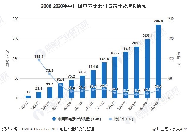 注:①CWEA在統(tǒng)計(jì)的數(shù)據(jù)僅公布至2018年,2019-2020年為前瞻根據(jù)BloombergNEF公布的所有風(fēng)電機(jī)制造廠商年度新增裝機(jī)量加總所得;