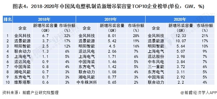 中國風(fēng)電整機(jī)制造市場(chǎng)也主要由我國本土廠商瓜分。其中,金風(fēng)科技、遠(yuǎn)景能源和明陽智能穩(wěn)居2018-2020年行業(yè)前三。2020年,三者的新增吊裝容量分別為12.33GW、10.07GW和5.64GW,市場(chǎng)份額分別為21%、17%和10%。