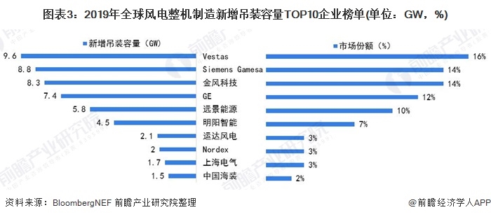 目前,我國以金風(fēng)科技、遠(yuǎn)景能源、明陽智能等為代表的風(fēng)電整機(jī)制造商技術(shù)已經(jīng)基本達(dá)到國際平均水平。據(jù)BloombergNEF數(shù)據(jù)顯示,2019年我國共有6家中國企業(yè)進(jìn)入全球風(fēng)電新增裝機(jī)容量前十榜單。其中,金風(fēng)科技排名第三,僅次于丹麥企業(yè)Vestas和西班牙企業(yè)Siemens Gamesa。其它入榜中國企業(yè)還包括遠(yuǎn)景能源、明陽智能、運(yùn)達(dá)風(fēng)電、上海電氣和中國海裝。