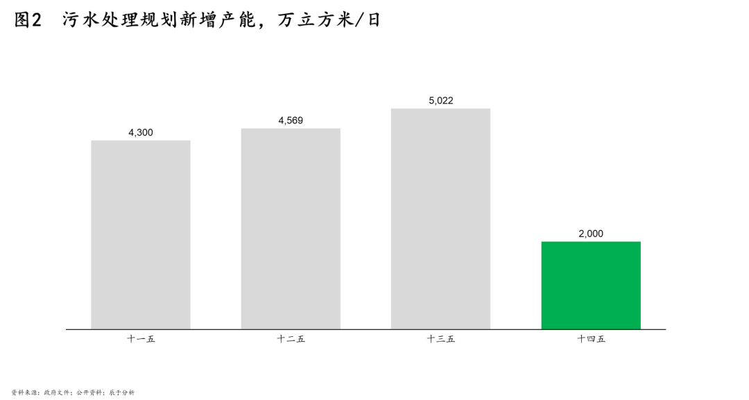 一是污水處理日漸成熟。近年我國城鎮(zhèn)污水處理任務已基本完成,城市污水處理率已經(jīng)達到95%以上,在“十四五”規(guī)劃中的污水處理新增產(chǎn)能也出現(xiàn)明顯下降(見圖2)。在污水處理漸趨飽和的情況下,先前遭到忽視的污泥處理問題重新得到關注。