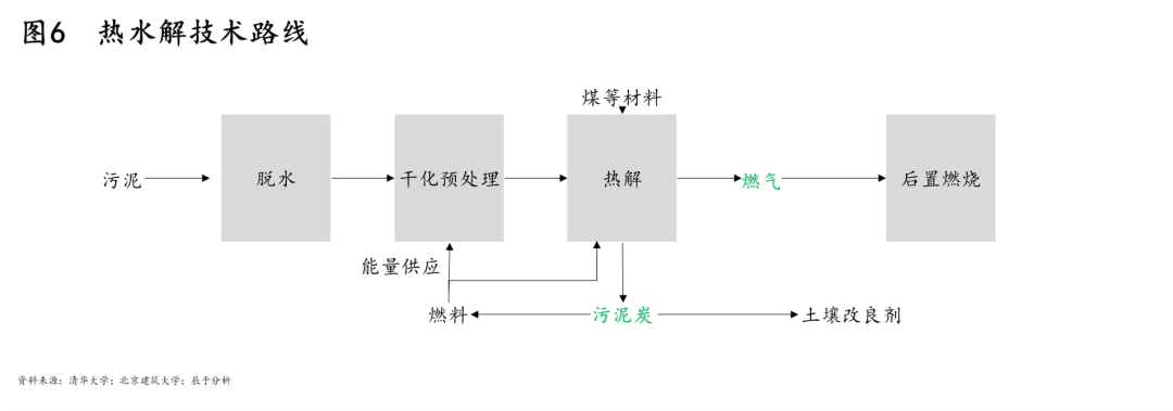 而在資源回收上,相比好氧堆肥,干化焚燒及熱水解則是更好的資源化方式,值得重點關注。干化焚燒的技術路線如圖5所示,作為最快捷、最徹底實現(xiàn)污泥減量化、穩(wěn)定化、無害化的最終處置技術,干化焚燒后的資源化利用產(chǎn)品也更易走通;熱水解的技術路線如圖6所示,其生產(chǎn)過程清潔化,生成的污泥炭資源多樣化。