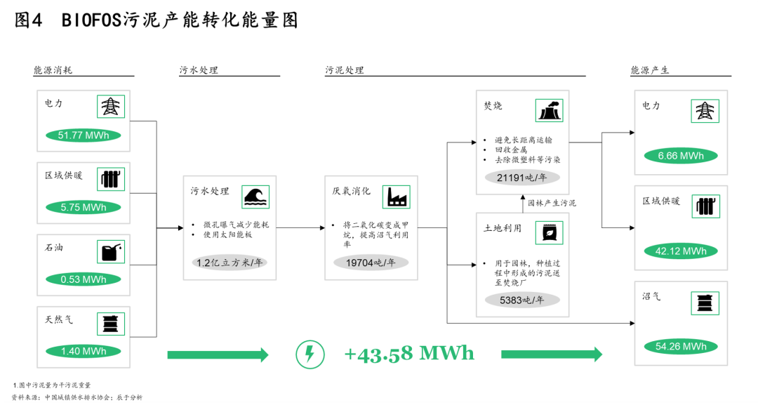 其二,30·60雙碳目標提出后,未來污泥處理處置將以節(jié)能降耗及能源資源回收為目標,這對污泥處理提出了更為清晰的技術路徑方向。例如在能源回收上,厭氧消化是優(yōu)選途徑,如丹麥污水廠BIOFOS通過污泥消化產(chǎn)能實現(xiàn)能量盈余(見圖4)。