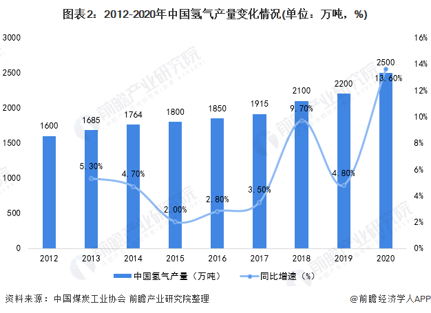 中國為全球第一產(chǎn)氫大國,年產(chǎn)氫氣上千萬噸。2012-2020年,中國氫氣產(chǎn)量整體呈穩(wěn)步增長趨勢。2020年,中國氫氣產(chǎn)量超過2500萬噸,同比增長13.6%。