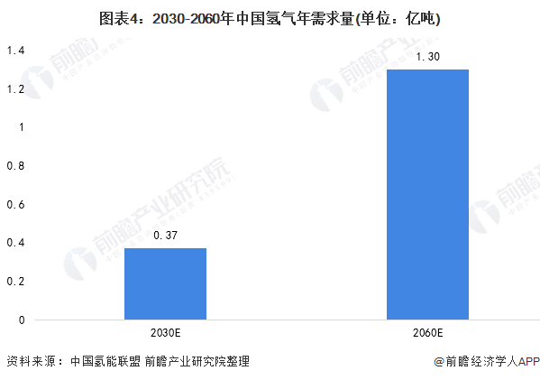 2021年4月21日,中國氫能聯(lián)盟發(fā)布《中國氫能源及燃料電池產(chǎn)業(yè)白皮書2020》,指出在2030年碳達(dá)峰情景下,我國氫氣的年需求量將達(dá)到3715萬噸,在終端能源消費中占比約為5%;在2060年碳中和情景下,我國氫氣的年需求量將增至1.3億噸左右,在終端能源消費中占比約為20%。