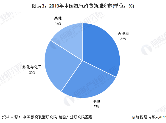 根據(jù)中國氫能聯(lián)盟研究院數(shù)據(jù)顯示,我國主要氫能源主要的應(yīng)用領(lǐng)域為工業(yè)領(lǐng)域,化工依然是氫氣最大的需求行業(yè)。2019年,我國合成氨和甲醇制取所需氫氣分別占32%和27%,煉化與化工也占據(jù)25%的份額。其余領(lǐng)域所占?xì)淠茉捶蓊~僅為16%。