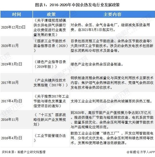 2020年發(fā)布的《關(guān)于清理規(guī)范城鎮(zhèn)供水供電供氣供暖行業(yè)收費促進行業(yè)高質(zhì)量發(fā)展的意見》和《國家工業(yè)節(jié)能技術(shù)裝備推薦目錄(2020)》分別從費用減免與技術(shù)推薦的角度推動余熱發(fā)電行業(yè)發(fā)展。