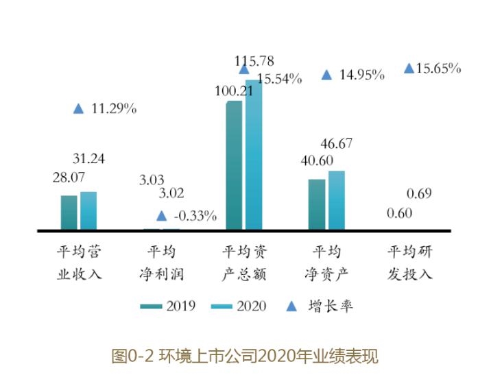 2020年,環(huán)境上市公司182家(涵蓋以節(jié)能環(huán)保及生態(tài)治理相關(guān)業(yè)務(wù)為主業(yè)的上市公司,包含滬深主板、創(chuàng)業(yè)板、科創(chuàng)板及香港主板、新加坡主板上市公司),平均營(yíng)業(yè)收入31.24億元,同比增長(zhǎng)8.85%;平均凈利潤(rùn)3.02億元,同比下降0.30%;平均凈利潤(rùn)率9.67%,同比下降0.89%;平均資產(chǎn)總額115.78億元,同比增長(zhǎng)15.54%;平均資產(chǎn)負(fù)債率59.69%,同比增長(zhǎng)0.20個(gè)百分點(diǎn);平均凈資產(chǎn)收益率(ROE)6.47%,同比下降0.99個(gè)百分點(diǎn);平均研發(fā)投入強(qiáng)度2.20%,同比增加0.13個(gè)百分點(diǎn)。
