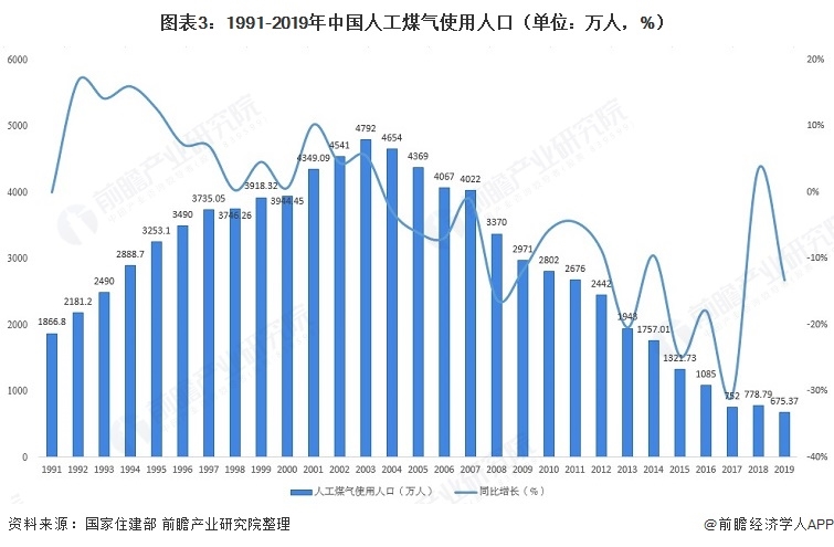 人工煤氣供應(yīng)量經(jīng)過上世紀(jì)90年代的大幅增長后,由于其污染較大、毒性較強(qiáng)等缺點(diǎn),進(jìn)入21世紀(jì)后使用量逐年減少。根據(jù)住建部數(shù)據(jù)顯示,1991-2003年,我國使用人工煤氣人數(shù)不斷增加,2003年使用人數(shù)達(dá)到巔峰為4792萬人,隨后開始逐步下降,2019年我國使用人工煤氣人數(shù)為675.37萬人。