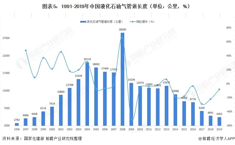 1991-2004年我國液化石油氣管道長度經(jīng)歷了穩(wěn)定增長,由1991年2762公里增加至2004年的20119公里,最后有所下降,2008年經(jīng)過飛速增長后達(dá)到28590公里以后,我國液化石油氣管道長度開始下降,2019年中國液化石油氣管道長度4452公里。