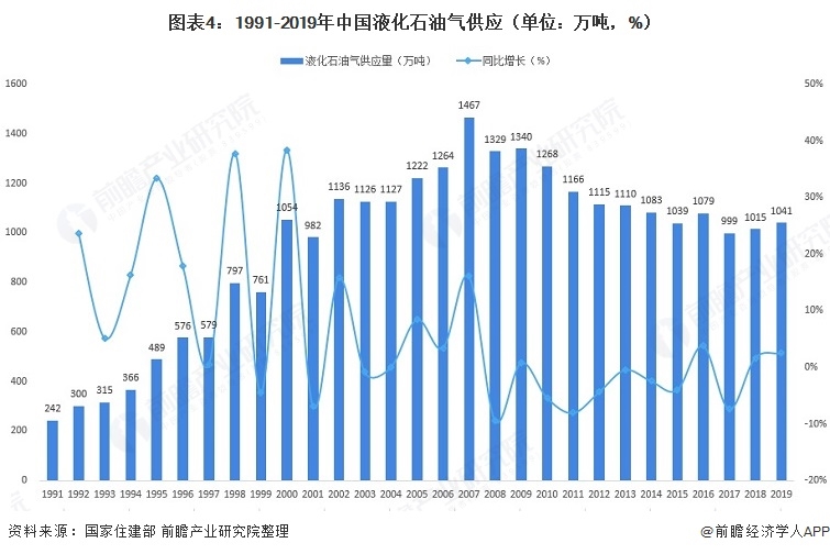 液化石油氣是在煉油廠內(nèi),由天然氣或者石油進(jìn)行加壓降溫液化所得到的一種無色揮發(fā)性液體。它極易自燃,當(dāng)其在空氣中的含量達(dá)到了一定的濃度范圍后,它遇到明火就能爆炸。國家住建部數(shù)據(jù)顯示,1991-2007年我國液化石油氣供應(yīng)經(jīng)歷了穩(wěn)定增長,由1991年供應(yīng)量242萬噸增加至2007年的1467萬噸,并達(dá)到最大,2007年以后我國液化石油氣供應(yīng)開始下降,但下降趨勢在2016年終止,近幾年液化石油氣受到石油價(jià)格上漲的影響,供應(yīng)量維持穩(wěn)定,2019年我國液化石油氣供應(yīng)1041萬噸。