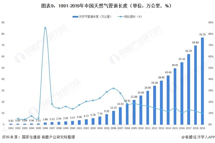 天然氣是優(yōu)質(zhì)高效、綠色清潔的低碳能源。加快天然氣開發(fā)利用,促進(jìn)協(xié)調(diào)穩(wěn)定發(fā)展,是我國推進(jìn)能源生產(chǎn)和消費(fèi)革命,構(gòu)建清潔低碳、安全高效的現(xiàn)代能源體系的重要路徑。1991-2019年我國天然氣管道長度逐年上升,1991年我國天然氣管道長度僅為0.81萬公里,而2019年則達(dá)到76.79萬公里。經(jīng)過前期快速發(fā)展,后期增速逐步放緩,2019年增速為10%。