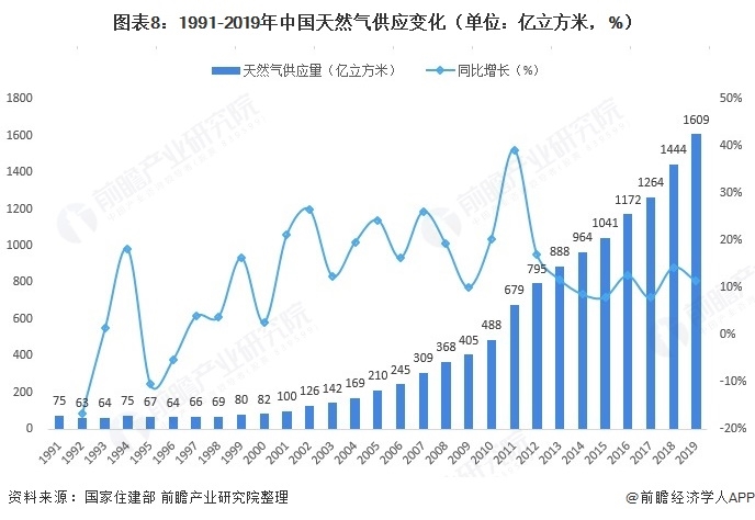 由于天然氣的以上特點(diǎn),住建部數(shù)據(jù)顯示,1991-2019年我國天然氣供應(yīng)量不斷增加,由最初1991年供應(yīng)量僅為75億立方米快速上漲至2019年的1609億立方米,2019年天然氣供應(yīng)是1991年的21倍多。