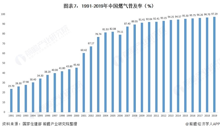 城市燃?xì)馄占奥?城市建成區(qū)使用燃?xì)馊藬?shù)/城市建成區(qū)人口×100%,城鎮(zhèn)燃?xì)庾鳛槌擎?zhèn)基礎(chǔ)設(shè)施建設(shè)的重要組成部分,在提升市民的生活質(zhì)量、改善自然環(huán)境和社會環(huán)境、推動(dòng)經(jīng)濟(jì)和社會的可持續(xù)發(fā)展等方面發(fā)揮著越來越重要的作用。自1991年以來我國城市燃?xì)馄占奥史€(wěn)步上升,2019年已經(jīng)達(dá)到97.29%。