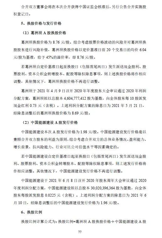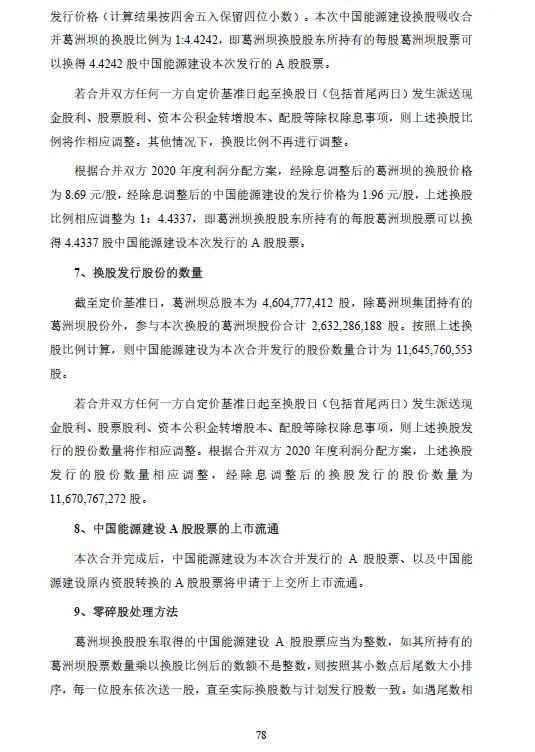 另悉,中國能源建設(shè)為本次合并發(fā)行的股份數(shù)量合計(jì)為11,645,760,553股。若合并雙方任何一方自定價(jià)基準(zhǔn)日起至換股日(包括首尾兩日)發(fā)生派送現(xiàn)金股利、 股票股利、資本公積金轉(zhuǎn)增股本、配股等除權(quán)除息事項(xiàng),上述換股發(fā)行的股份數(shù)量相應(yīng)調(diào)整,經(jīng)除息調(diào)整后的換股發(fā)行的股份數(shù)量為11,670,767,272股。