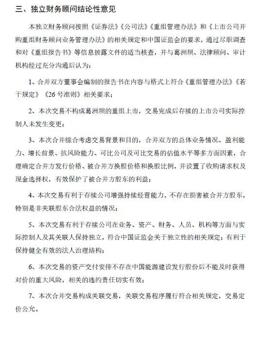 獨(dú)立財(cái)務(wù)顧問結(jié)論性意見顯示,本次交易不構(gòu)成葛洲壩的重組上市,交易完成后存續(xù)的上市公司實(shí)際控制人未發(fā)生變更;本次交易有利于存續(xù)公司增強(qiáng)持續(xù)經(jīng)營能力,不存在損害被合并方股東,特別是非關(guān)聯(lián)股東合法權(quán)益的情況;本次合并交易構(gòu)成關(guān)聯(lián)交易,關(guān)聯(lián)交易程序履行符合相關(guān)規(guī)定,交易定價(jià)公允。