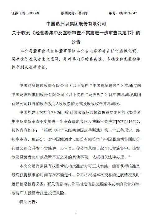 另據(jù)相關(guān)監(jiān)管部門對(duì)葛洲壩出具的《經(jīng)營者集中反壟斷審查不實(shí)施進(jìn)一步審查決定書》顯示:“經(jīng)初步審查,現(xiàn)決定,對(duì)中國能源建設(shè)股份有限公司與中國葛洲壩集團(tuán)股份有限公司合并案不實(shí)施進(jìn)一步審查。你公司從即日起可以實(shí)施集中。該案涉及經(jīng)營者集中反壟斷審查之外的其他事項(xiàng),依據(jù)相關(guān)法律辦理”。
