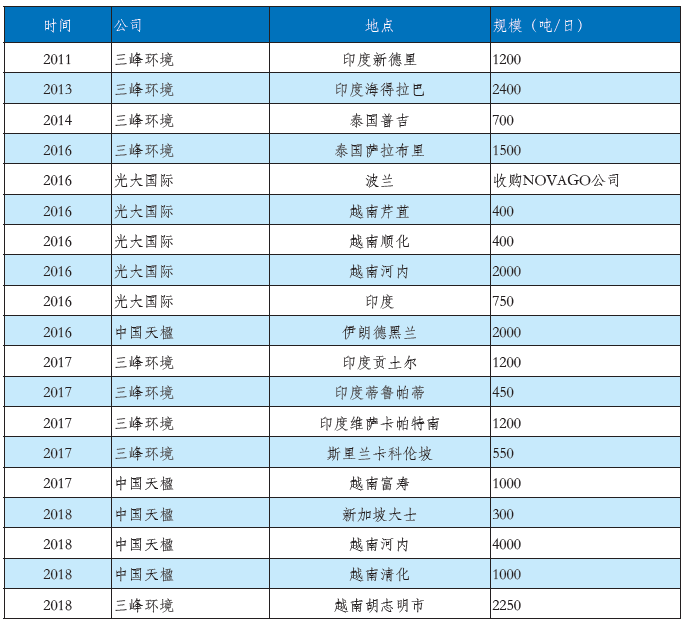 在固廢領(lǐng)域,具備自主設(shè)備制造能力的三峰環(huán)境、光大國(guó)際、中國(guó)天楹等企業(yè)也已經(jīng)成功邁出國(guó)際化的堅(jiān)實(shí)一步。以三峰環(huán)境為例,2013年走出國(guó)門(mén),投資并運(yùn)營(yíng)多座生活垃圾填埋場(chǎng)、危險(xiǎn)廢物處理廠、垃圾資源化回收利用廠以及生活垃圾發(fā)電廠。同年,隆企集團(tuán)贏得印度首批垃圾發(fā)電項(xiàng)目,確定與三峰環(huán)境合作,并采用三峰環(huán)境提供的設(shè)備和技術(shù)方案。目前三峰環(huán)境的技術(shù)設(shè)備已應(yīng)用到美國(guó)、印度、埃塞俄比亞、泰國(guó)、斯里蘭卡、越南、巴西等七個(gè)國(guó)家的垃圾焚燒發(fā)電項(xiàng)目?!耙粠б宦贰本G色發(fā)展國(guó)際聯(lián)盟戰(zhàn)略合作伙伴之一的光大國(guó)際,于2016年6月23日簽署初步買(mǎi)賣(mài)協(xié)議收購(gòu)NOVAGO,是中國(guó)在東中歐環(huán)保市場(chǎng)中最大的一個(gè)收購(gòu)項(xiàng)目。同年12月,光大國(guó)際與越南簽署芹苴垃圾發(fā)電投資協(xié)議,項(xiàng)目設(shè)計(jì)日處理生活垃圾400噸。同年,中國(guó)電建所屬水電顧問(wèn)集團(tuán)在深圳與越南UDIC投資公司、光大國(guó)際有限公司,越南河內(nèi)市環(huán)衛(wèi)公司舉行會(huì)談并簽署了越南河內(nèi)南山垃圾發(fā)電項(xiàng)目合作協(xié)議,項(xiàng)目處理能力為2000噸/天,為越南最大垃圾發(fā)電項(xiàng)目。