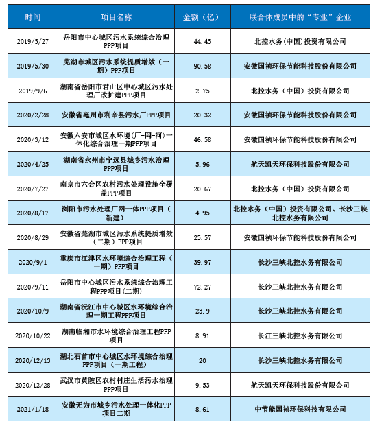 縱觀這些省級(jí)環(huán)保平臺(tái),不難發(fā)現(xiàn)一些共同點(diǎn):1.業(yè)務(wù)幾乎聚焦省內(nèi),但涵蓋水、固、氣、土、生態(tài)修復(fù)等各個(gè)細(xì)分領(lǐng)域;2.業(yè)態(tài)均覆蓋投資、工程、服務(wù)等,而相對(duì)的,運(yùn)營(yíng)能力普遍不高;3.很多項(xiàng)目與專業(yè)公司合作,省級(jí)平臺(tái)主要開(kāi)展投資、承攬工程,專業(yè)公司負(fù)責(zé)技術(shù)和運(yùn)營(yíng)。其實(shí)這些平臺(tái)公司的定位也很明確,政府主導(dǎo)成立地方平臺(tái),就是要統(tǒng)籌資源、協(xié)調(diào)各方力量,就是要作為政府伸出去的通過(guò)市場(chǎng)手段解決問(wèn)題的手,這樣想來(lái),上述特點(diǎn)也就不難理解了。目前國(guó)內(nèi)已經(jīng)形成了三類(lèi)這樣的“區(qū)域平臺(tái)公司”——國(guó)家級(jí)平臺(tái)、省級(jí)平臺(tái)和地市縣級(jí)平臺(tái),其中:國(guó)家級(jí)平臺(tái)無(wú)疑就是以長(zhǎng)江經(jīng)濟(jì)帶7省2市為區(qū)域的長(zhǎng)江環(huán)保集團(tuán),這是國(guó)家層面成立的用于統(tǒng)籌協(xié)調(diào)跨省層面的資源、關(guān)系的市場(chǎng)化平臺(tái);省級(jí)平臺(tái)如上所述,是用來(lái)統(tǒng)籌協(xié)調(diào)省級(jí)(跨地市)層面的資源、關(guān)系的市場(chǎng)化平臺(tái);區(qū)別于上兩級(jí)平臺(tái),地市縣平臺(tái)則更多的用于解決特定的小區(qū)域環(huán)保問(wèn)題,隨著“一張藍(lán)圖繪到底”的總體部署,這類(lèi)平臺(tái)所能發(fā)揮的作用將會(huì)越來(lái)越小。而這些“區(qū)域平臺(tái)公司”要想解決實(shí)際問(wèn)題,除了要利用自身優(yōu)勢(shì)協(xié)調(diào)政策、資金、各利益相關(guān)主體外,很重要的一點(diǎn),就是要通過(guò)市場(chǎng)化手段解決專業(yè)性問(wèn)題,他們往往采取的手段就是“聯(lián)合體投標(biāo)”和并購(gòu),這在長(zhǎng)江環(huán)保集團(tuán)的動(dòng)作上尤為典型。長(zhǎng)江環(huán)保集團(tuán)典型“聯(lián)合體投標(biāo)”項(xiàng)目