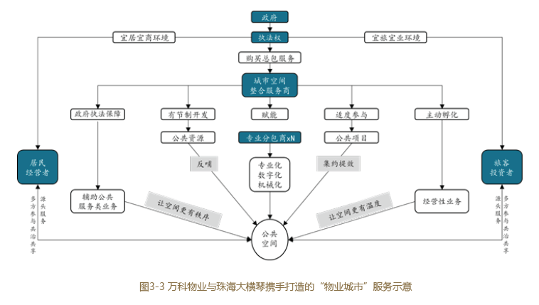 在這一變化趨勢(shì)下,還將催生若干新的業(yè)態(tài)。例如萬(wàn)科物業(yè)與珠海大橫琴攜手打造的“物業(yè)城市”,將物業(yè)、環(huán)衛(wèi)、園林等業(yè)務(wù)進(jìn)行進(jìn)一步融合,形成“城市管家”的全新業(yè)務(wù)形態(tài)(圖3-3)。立足于此,在城市與生態(tài)系統(tǒng)深度融合發(fā)展的未來(lái),以生態(tài)承載力為前提的產(chǎn)業(yè)布局和空間布局(現(xiàn)在已經(jīng)在進(jìn)行實(shí)踐探索)將與現(xiàn)在的城市和產(chǎn)業(yè)形態(tài)大相徑庭,彼時(shí)的生態(tài)治理與維護(hù)又將呈現(xiàn)何種形態(tài)?我們不得而知,但可想象必將催生一系列的不同業(yè)態(tài)和企業(yè)。