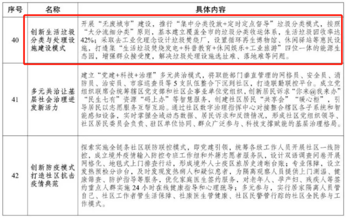 開(kāi)展"無(wú)廢城市"建設(shè),推行"集中分類投放+定時(shí)定點(diǎn)督導(dǎo)"垃圾分類模式,按照創(chuàng)新生活垃圾"大分流細(xì)分類"原則,基本建立覆蓋全市的拉圾分類收運(yùn)體系,生活拉圾回收率達(dá)分類與處理設(shè)42%;采取去工業(yè)化理念設(shè)計(jì)垃圾焚燒廠,設(shè)置循環(huán)再生博物館、休閑驛站等惠民設(shè)施建設(shè)模式施,打造集"生活垃圾焚燒發(fā)電+科普教育+休閑娛樂(lè)+工業(yè)旅游"四位一體的能源生態(tài)園,增強(qiáng)群眾接受度,解決垃圾處理設(shè)施選址難、落地難等問(wèn)題。