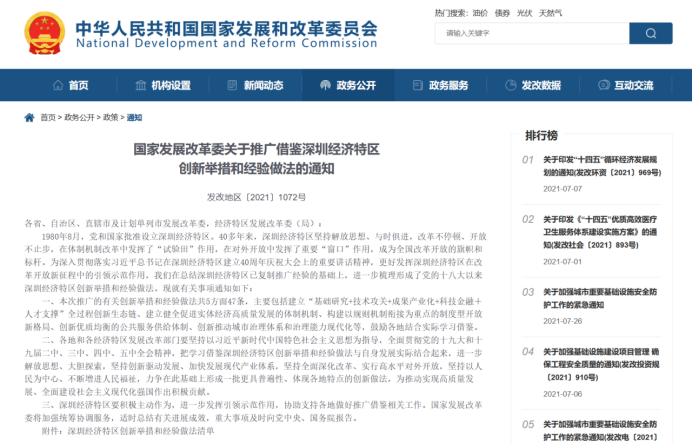 國(guó)家發(fā)展改革委關(guān)于推廣借鑒深圳經(jīng)濟(jì)特區(qū)