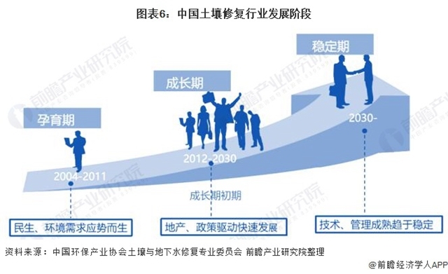 相較國外,國內(nèi)土壤及地下水修復行業(yè)相對國外而言起步較晚,大致劃分為三個階段—孕育期、成長期、穩(wěn)定期,我國土壤及地下水修復行業(yè)目前處于成長期。