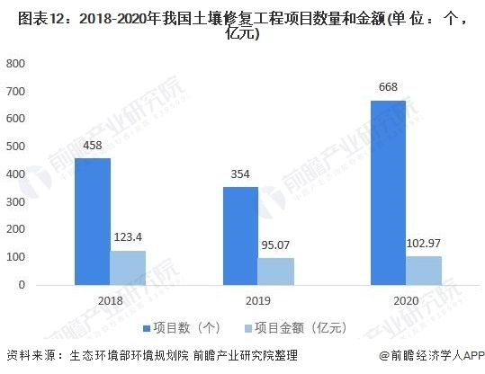 2020年全國正式啟動土壤修復工程項目668個,總項目金額約為102.97億元,覆蓋全國除西藏、港澳臺以外的30個省(市、區(qū))。與2019年相比,項目金額增長8.31%,項目數(shù)量從354個項目增加到668個項目,數(shù)量增加非常明顯。近三年全國土壤修復工程市場總金額總體較為穩(wěn)定,近兩年基本維持在一百億元左右。