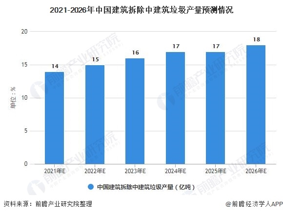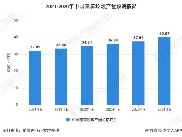 前瞻根據(jù)初步預(yù)測(cè)到2021年我國(guó)需要處理的建筑垃圾產(chǎn)量將達(dá)到32.09億噸,2026年,產(chǎn)量有望突破40億噸;若以35元/噸(運(yùn)輸費(fèi)與處置費(fèi))計(jì)算,預(yù)計(jì)2021年建筑垃圾處理市場(chǎng)規(guī)模將超過(guò)1400億元。