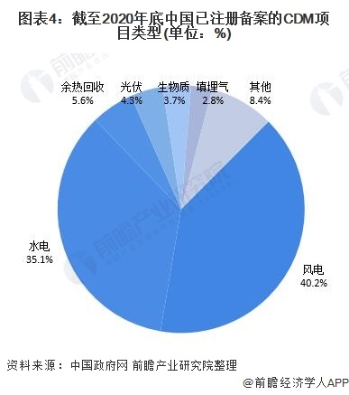 從項(xiàng)目類(lèi)型來(lái)看,截至2020年底,我國(guó)已注冊(cè)備案的CDM項(xiàng)目主要集中于風(fēng)能、水力等領(lǐng)域,兩者項(xiàng)目達(dá)2834個(gè),占比達(dá)78.7%。