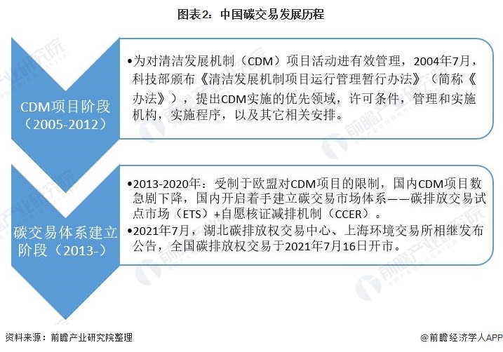 我國(guó)碳交易體系建立階段包括碳交易試點(diǎn)與全國(guó)統(tǒng)一碳排放權(quán)交易兩個(gè)階段。2013年起,我國(guó)借鑒歐盟碳交易機(jī)制(EU-ETS),在北京、天津、上海、湖北、廣東、深圳、重慶、福建、四川九個(gè)省市開(kāi)啟區(qū)域碳排放交易試點(diǎn)。2021年7月16日,全國(guó)碳排放權(quán)交易開(kāi)市。