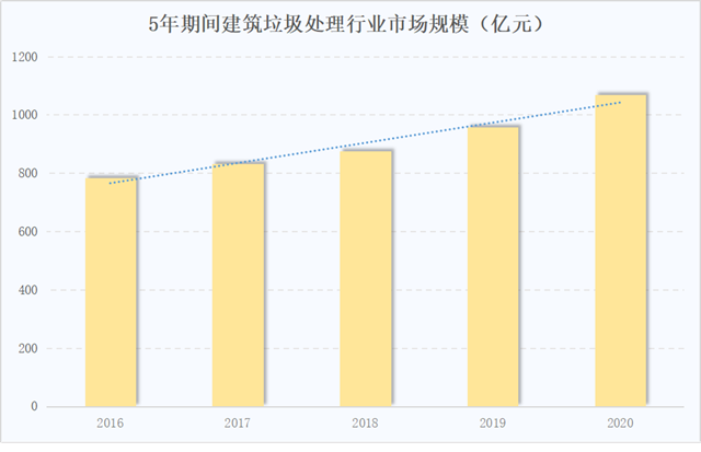 隨著建筑垃圾產(chǎn)量的提高,其處理市場也不斷擴(kuò)大。顯而易見的是,近五年來的市場規(guī)模整體呈上升趨勢。2017年突破了800億元,2019年已經(jīng)接近千億,2020年達(dá)到了1068.31億元。如果按此數(shù)據(jù)持續(xù)增長,到2021年,建筑垃圾市場規(guī)模有望達(dá)到1200億元。