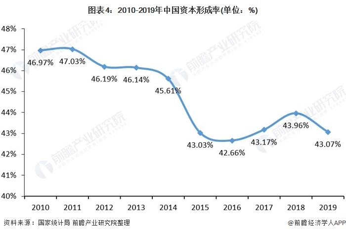 2007年以來,中國(guó)資本形成率(一定時(shí)期內(nèi)資本形成總額占國(guó)內(nèi)生產(chǎn)總值的比重)維持在40%以上,2011年為47.03%,為近些年資本形成率最高年份,隨后呈下降趨勢(shì),2019年資本形成率達(dá)43.07%。資本形成率有待提升。