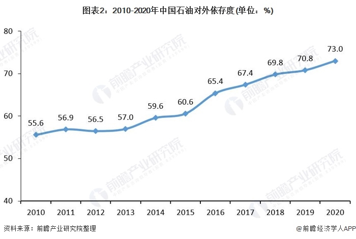 根據(jù)中國(guó)石油經(jīng)濟(jì)技術(shù)研究院發(fā)布的《2020年國(guó)內(nèi)外油氣行業(yè)發(fā)展報(bào)告》,2020年,中國(guó)石油對(duì)外依存度(一個(gè)國(guó)家原油凈進(jìn)口量占本國(guó)石油消費(fèi)量的比例)達(dá)到73%。