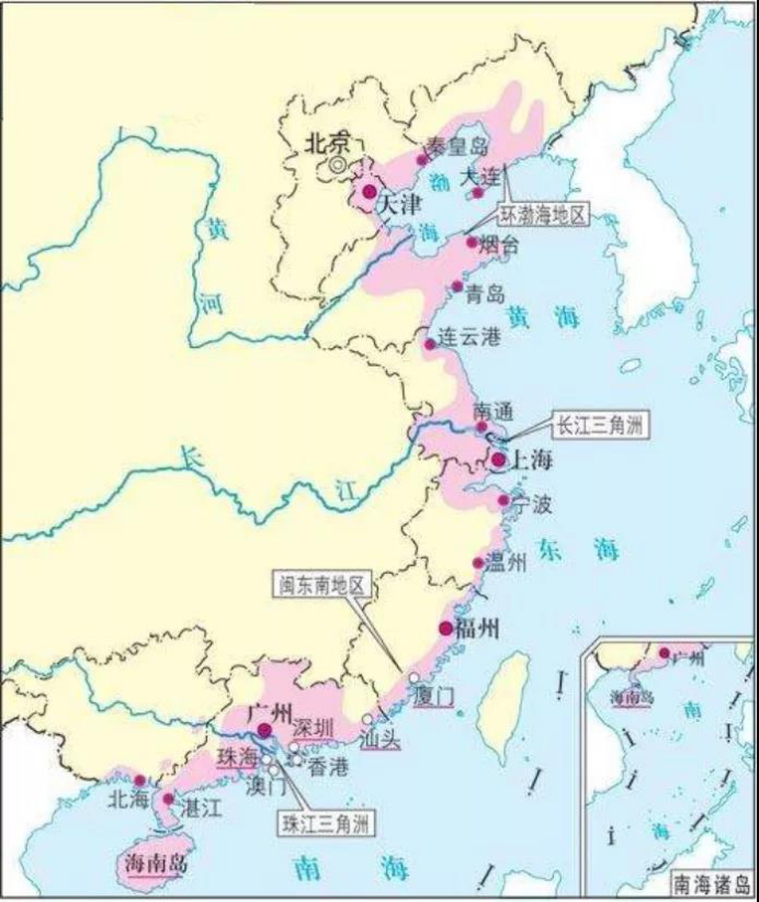 根據(jù)2012版《中國(guó)海洋統(tǒng)計(jì)年鑒》,我國(guó)大陸海岸線長(zhǎng)達(dá)1.8萬km,包括9個(gè)沿海?。ㄟ|寧、河北、山東、江蘇、浙江、福建、廣東、海南)、1個(gè)自治區(qū)(廣西)、2個(gè)直轄市(上海、天津);53個(gè)沿海城市、242個(gè)沿海區(qū)縣。