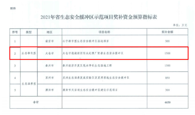 7月5日,省財政廳、省生態(tài)環(huán)境廳下發(fā)《關于下達2021年省生態(tài)安全緩沖區(qū)示范項目獎補資金的通知》(蘇財資環(huán)〔2021〕29號),給予太倉市1500萬元生態(tài)安全緩沖區(qū)示范項目獎補。這是太倉市繼2020年獲得“國家生態(tài)文明建設示范市”榮譽后,在生態(tài)文明建設工作方面再次獲得的兩項殊榮!