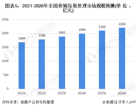 畜禽糞污資源化利用的步伐明顯加快,有力促進(jìn)了畜牧業(yè)生產(chǎn)與環(huán)境保護(hù)協(xié)調(diào)發(fā)展。前瞻初步預(yù)計到2026年,我國養(yǎng)殖垃圾處理市場規(guī)模將達(dá)到2200億元。