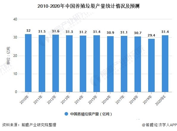快速發(fā)展的畜牧業(yè),在保證了不斷增長的畜產(chǎn)品需求的同時,也產(chǎn)生了大量的養(yǎng)殖廢棄物。不同禽畜產(chǎn)生的糞便量不同,前瞻根據(jù)禽畜養(yǎng)殖規(guī)模,結(jié)合禽畜飼養(yǎng)周期以及飼養(yǎng)量對全國養(yǎng)殖垃圾產(chǎn)量進(jìn)行估計,2020年全國養(yǎng)殖垃圾產(chǎn)量約為31.4億噸,給環(huán)境治理帶來了巨大的壓力。