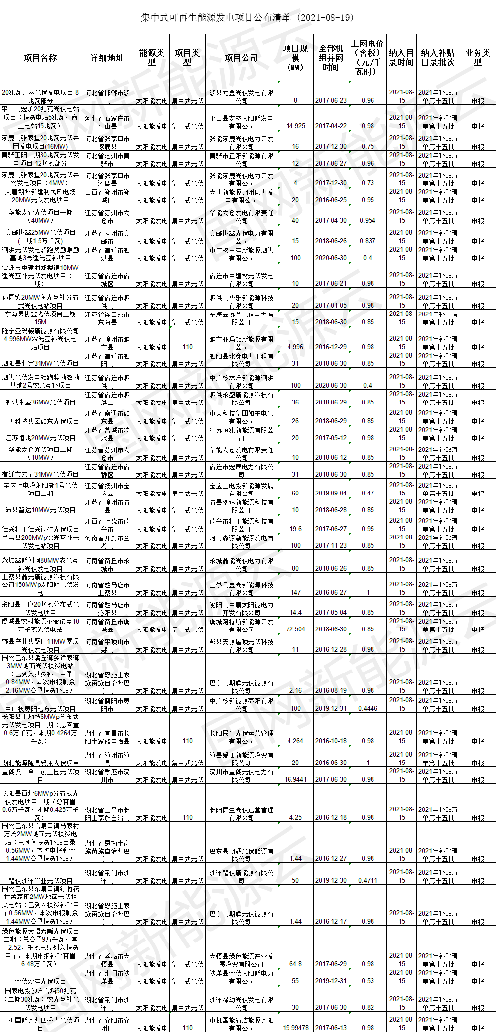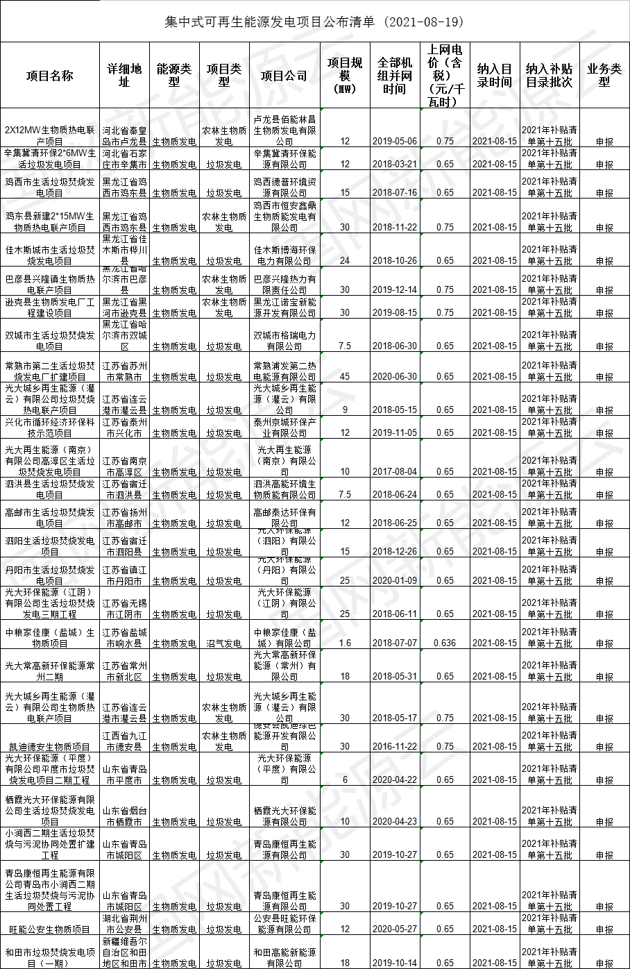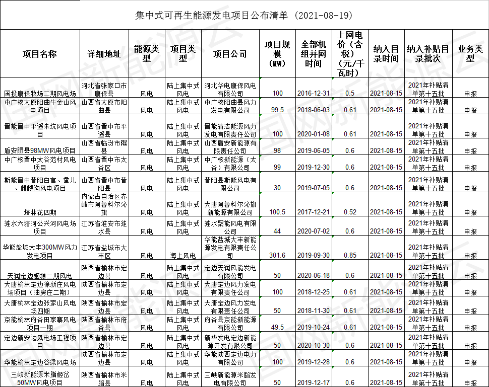 2021年8月15日,我公司已將完成公示的2021年第十五批可再生能源發(fā)電項(xiàng)目補(bǔ)貼項(xiàng)目清單上報(bào)國(guó)家主管部門(mén),現(xiàn)將十五批可再生能源發(fā)電并網(wǎng)項(xiàng)目清單詳情盤(pán)點(diǎn)如下: