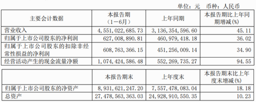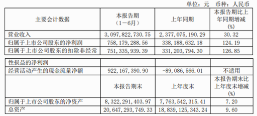 截至報告期內,公司經營狀況持續(xù)走高,實現營業(yè)收入21.62億元,較上年增長199.93%;實現歸母凈利潤51.03億元,較上年增長7.7%。